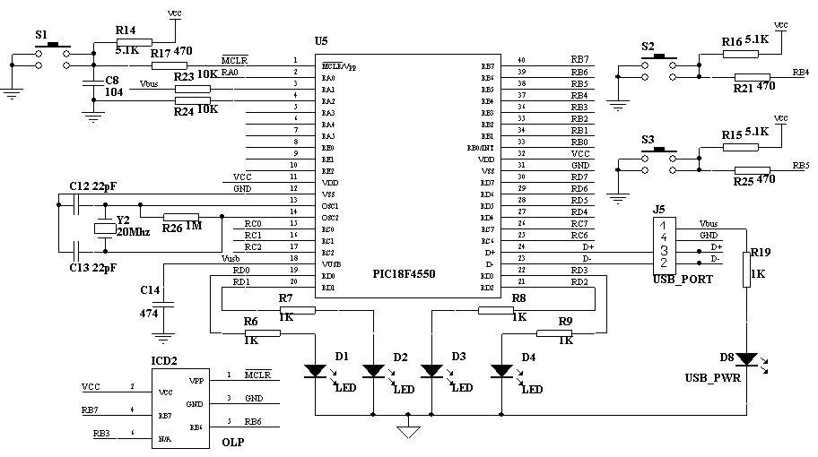 Figure 1: Schematics for the PIC18F4550 USB Demo