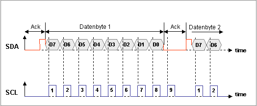 - Daten werden immer mit steigender Taktflanke von SCL gültig.